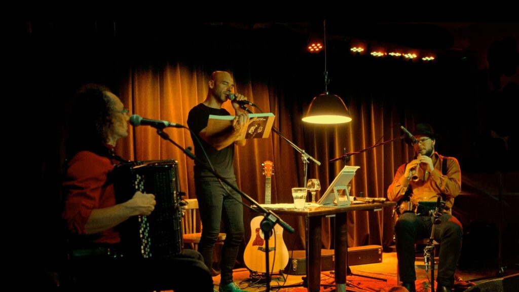 Met Wouter Kuyper op trekzak en doedelzak, Patricia Swart op saxofoon en Lenny de Rooy op doedelzak en zang.